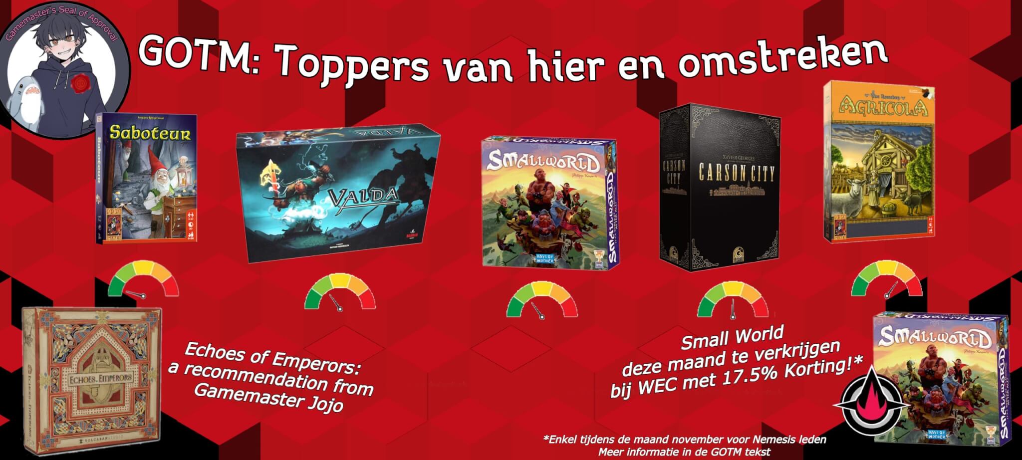 - Onze trouwe sponsor, de WEC, gaat voor elke maand 1 bordspel binnen het thema van de GOTM aan 17.5% korting voorzien ipv. de gewoonlijke 12.5% korting.